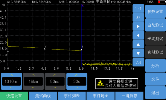 自动测试功能使得用户无需了解更多的有关该仪器操作的细节,测试步骤变得非常简单,只需要进入“自动OTDR”,将光纤接入产品对应OTDR端口、点击【自动测试】按钮即可,仪器会自动设置相应的测试条件并给出最终测试结果,包括测试曲线和事件列表等。